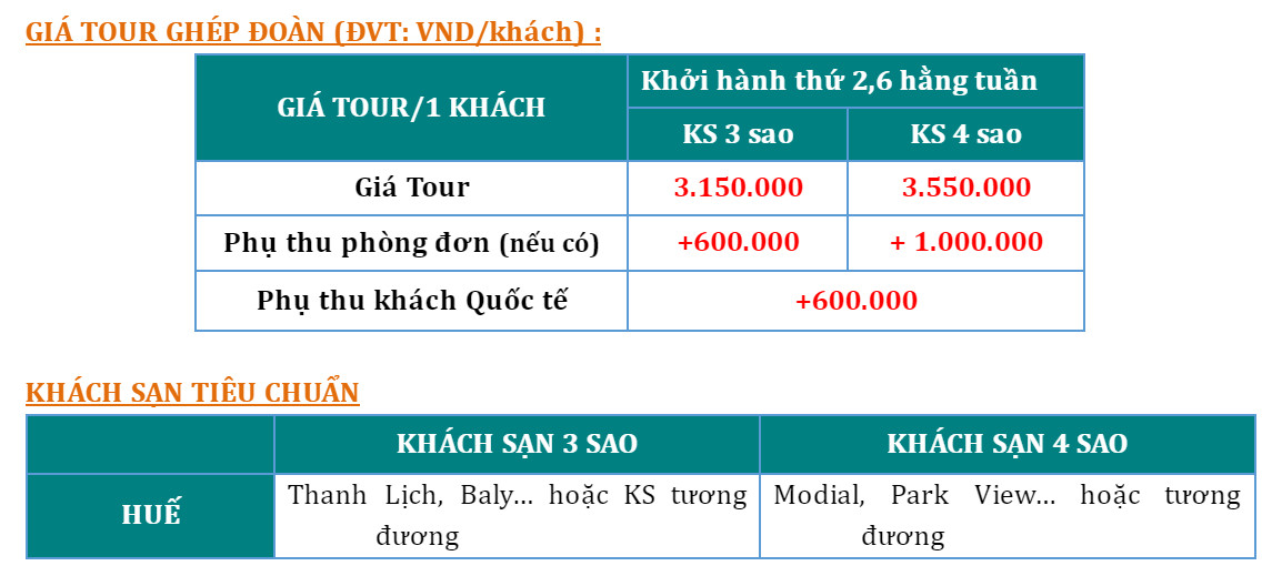 HÀNH TRÌNH DI SẢN: HUẾ- ĐỘNG PHONG NHA/THIÊN ĐƯỜNG Khởi hành: Thứ 3 hoặc Thứ 7 hàng tuần Phương tiện: Ôtô LỊCH TRÌNH CHI TIẾT THAM KHẢO Sáng: Đón khách theo điểm hẹn tại Huế thời gian từ 06h00 đến […]